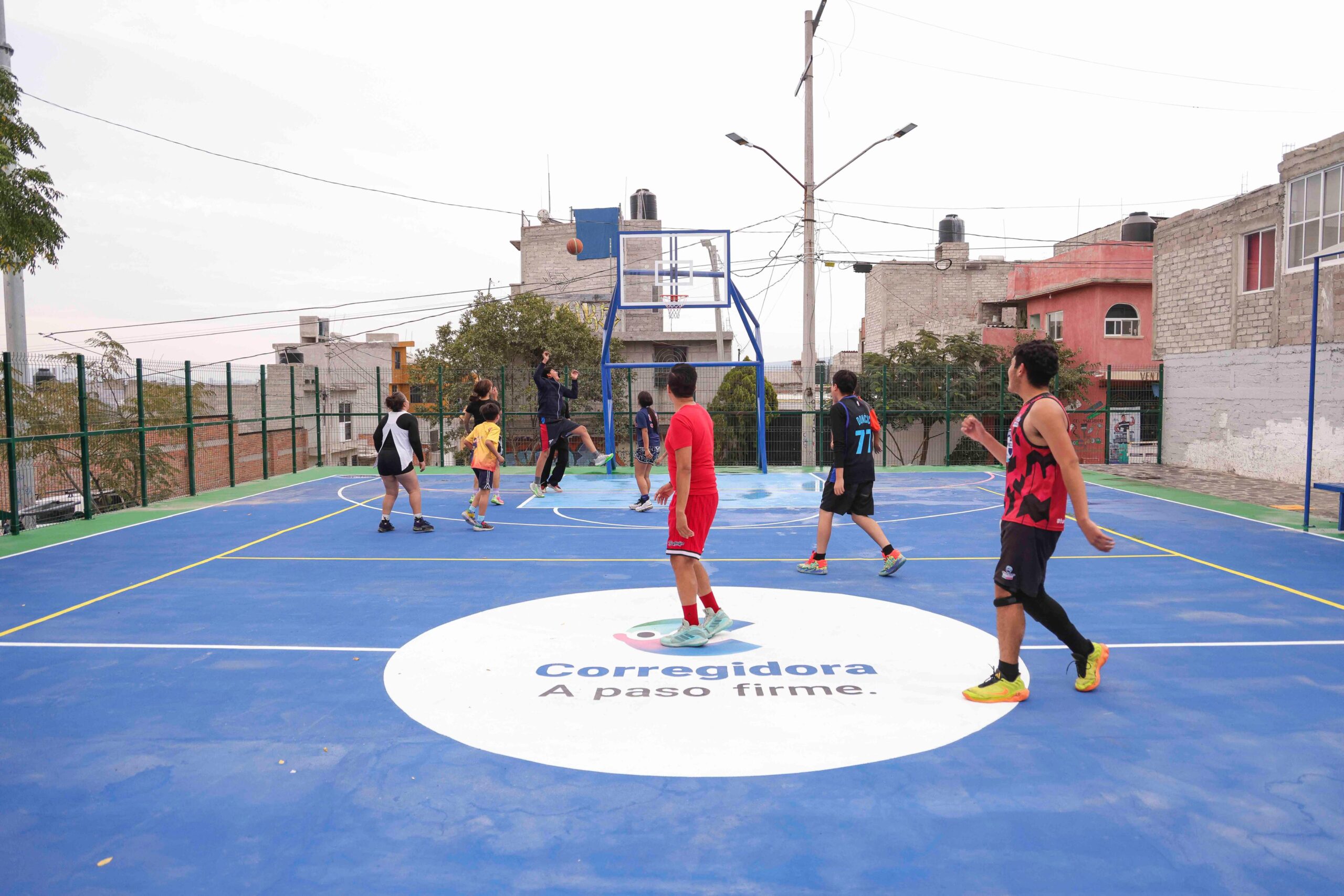 La intervención fue amplia. El piso de concreto y piedra laja marca los recorridos; el muro de contención de mampostería de cantera sostiene el terreno y también la intención de permanencia. La cancha rehabilitada, los tableros de basquetbol y el muro de piedra delinean un espacio pensado para el movimiento y el juego.